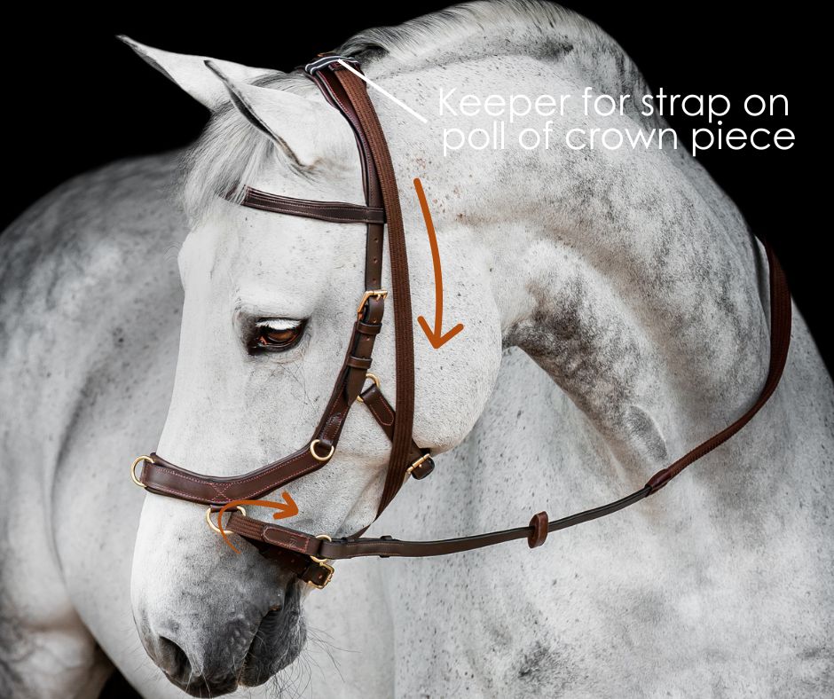Your bridle will arrive partially assembled, if you disassemble your bridle, check when placing it back together that the arrow on the headpiece is pointing towards your horse's forelock. The shaped edge next to the ears will be slightly straighter than the edge facing the wither.